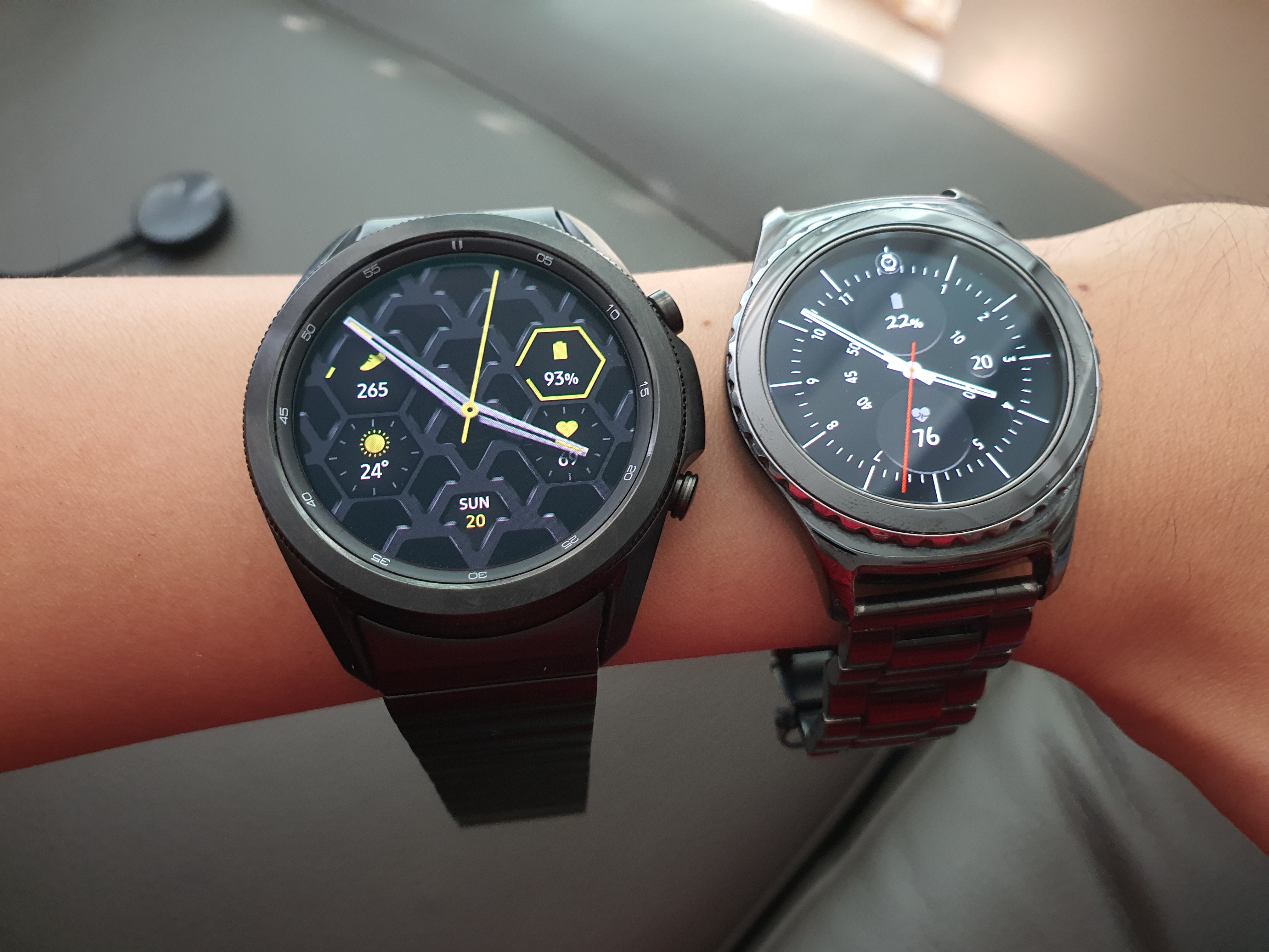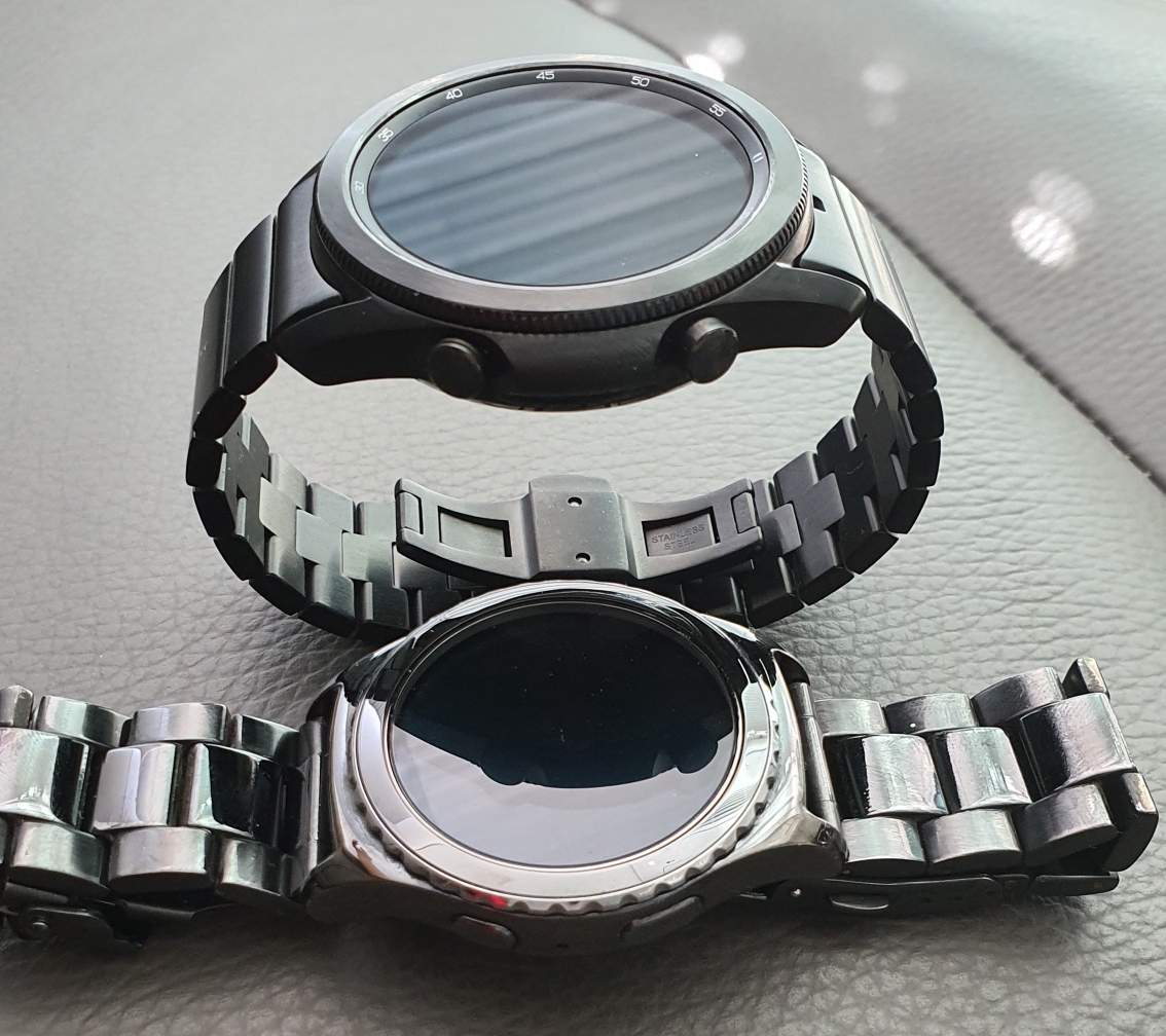 기존에 사용하던 기어 S2와 갤럭시 워치3 티타늄의 크기 비교